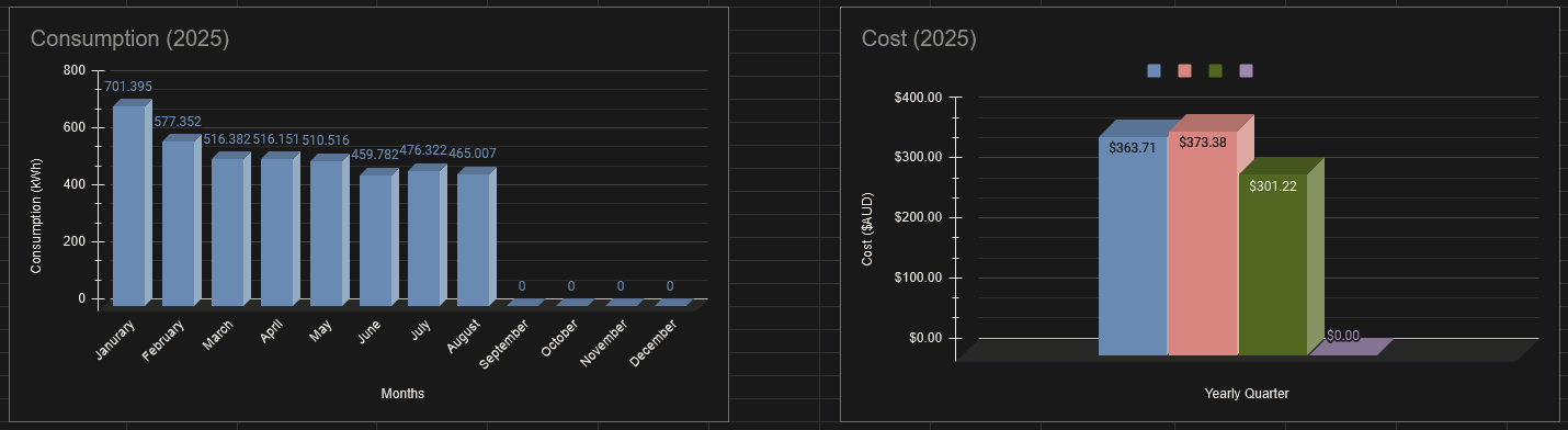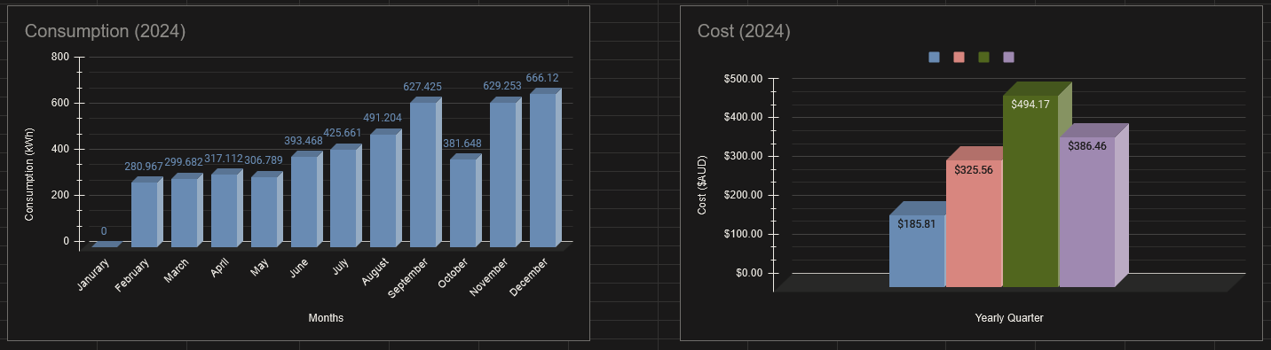 The below chart shows you our energy consumption in kWh, plus our energy bills (in $AUD) each quarter.